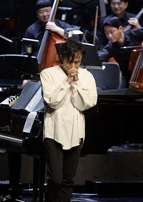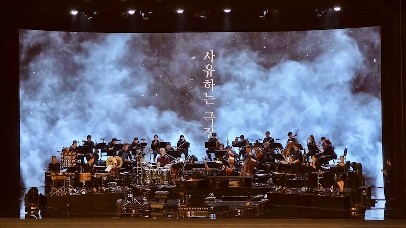 夜想月零という曲で情感溢れるエレクトリックギター、その他でアコースティックギター、ウクレレ、マンドリンに至るまで多くの楽器を駆使し、真摯に楽曲にアップローチしてくれるギタリスト;パクサンヒュン。新たに参加したマンドリンも演奏するベーシスト;チョ・ピョンジェ。 日本から参加してくれたソロバイオリン吉田翔平くんと1回目から参加しているソロチェロ;ナイングク君。19人弦奏者からなるSAYUオーケストラ、彼らのアプローチも圧巻でした。映像などたくさんの演出的な束縛が存在しましたが、スケール感と深淵さんを兼ね備えた演奏をしてくれました。更にこの楽曲オーケストラ編曲を補助しエレクトリック音源マニピュレーションをステージ袖で 支えてくれたソンドンフン君にも感謝です。
