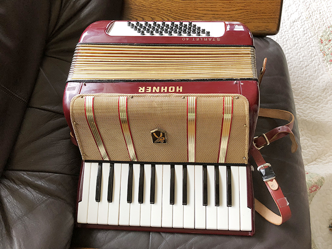 小型で赤がトレ?ドマ?ク、公演で度?使っているので僕のライブでは馴染み深いかもしれませんね。ドイツを代表するHohner製の古いビンテ?ジタイプ。音色切り替えスイッチのない?一音色でリ?ドは2枚のダブルタイプ、そのピッチのズレ度合いが(Detuneと言う)大きく、フランスシャンソン系のおしゃれで細い音色と言うより、野外でもバリバリ聞こえてくる野太いイメ?ジで、アイリッシュやワ?ルドミュ?ジック的な曲にバッチリ!ライブではこんな感じです^^